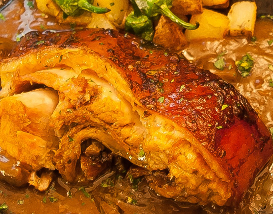 Ejemplo de ello es el «Lechón la Bella Neda». Cerdos de aproximadamente 40 kilos, adobados y macerados durante toda una noche y cocinados a muy baja temperatura en su antiguo horno, durante al menos 24 hs, y servido en ración individual con colchón de Ragout de Setas.